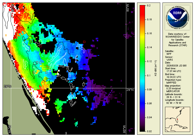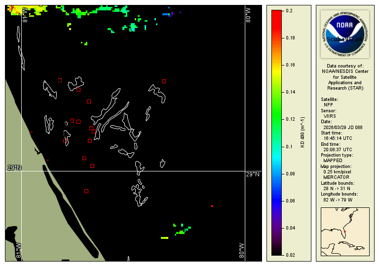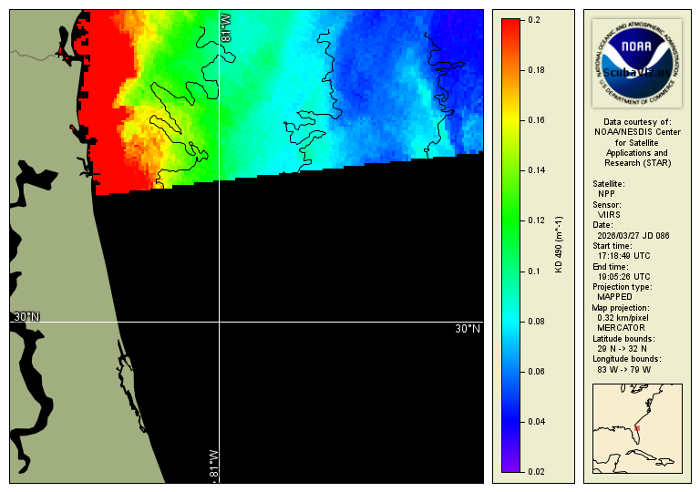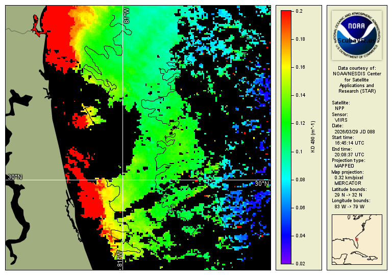 These images show the measured "Kd" value (diffuse attenuation coefficient). Studies have shown that this is a good analog to represent light attenuation and water clarity. This is a calculated value based on the amount of 490nm blue light as seen from space. These are 3 different satellites that pass over daily. The relevant data range is based on what has been determined to be relevant based on in situ diver reports.