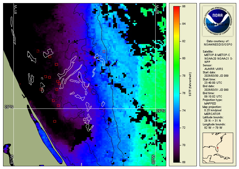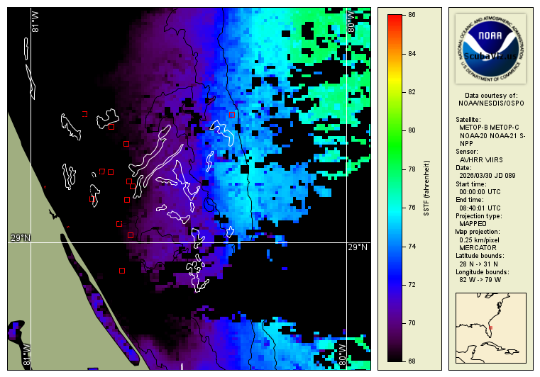 This satellite data product is updated daily at 3am EST. It is a composite of satellite images from the previous afternoon. If there are clouds on some of the images or the SST is changing significantly during the day it may result in unusual anomalies in the image. For more precise analysis of SST use the individual SST images listed here:Volusia AVHRR SST